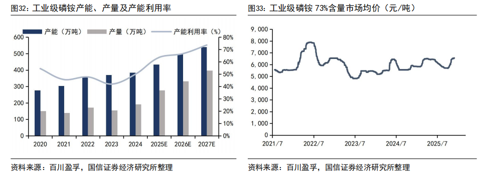 工业级磷酸一铵产能持续扩张,高端需求有望驱动利用率回升。近年来,我国工业级磷酸一铵行业整体呈现产能稳步扩张但利用率长期偏低。2020-2024年,行业产能由276万吨增至384万吨,年均复合增速约8.6%,但同期产能利用率始终徘徊在40%-50%区间,反映出结构性过剩与有效需求不足并存的矛盾。一方面,大量中小厂商以低端二水法工艺生产普通工业级产品,同质化严重;另一方面,高纯消防级、电池级等高端产品供给集中于少数龙头企业,技术壁垒高、认证周期长。展望2026-2027年,假设百川盈孚统计的在建产能均顺利投产,产量增速保持在20%,行业产能利用率有望显著回升,预计从2024年的49.9%提升至2027年的73.6%,供需格局逐步转向紧平衡,具备高纯工艺和一体化成本优势的企业将率先受益。