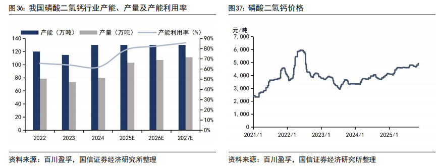 2025年预计磷酸二氢钙产能利用率显著回升。2022-2024年,磷酸二氢钙产能基本稳定在115-130万吨,产量小幅波动,产能利用率维持在61%-66%,反映需求平稳、供给相对宽松;自2025年起,随着下游饲料升级及水产养殖扩张,产量显著提升。鉴于目前行业内未见确定新增产能,预计2025-2027年产能利用率有望攀升至79%-86%,供需格局偏紧。磷酸二氢钙产量持续提升,主要受益于饲料行业“禁抗”政策推动配方升级、规模化养殖对高生物利用率磷源的需求增加,以及水产和幼畜饲料中对其高水溶性特性的依赖;同时,出口市场(尤其是东南亚)稳步扩张,叠加头部企业产能释放和技术进步,共同驱动产量及产能利用率显著提升。