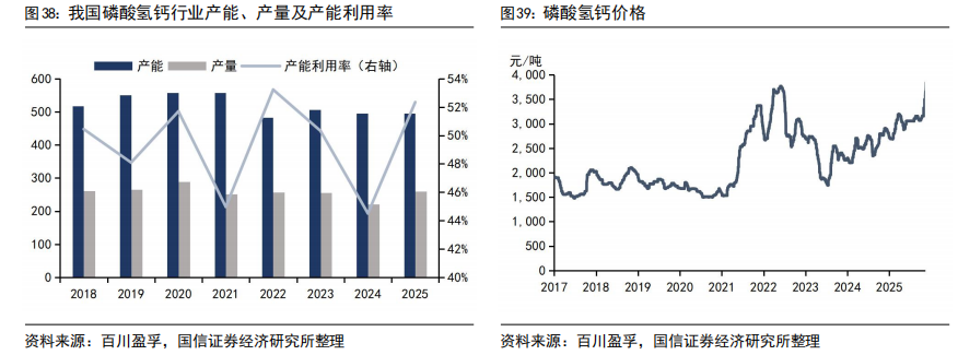 2022年起开启我国磷酸氢钙行业产能优化调整,整体规模收缩,2020年产量达阶段高点后整体回落,2025年随需求边际改善小幅回升,行业在产能过剩的背景下,开工水平受下游需求主导,产能利用率始终处于偏低水平。