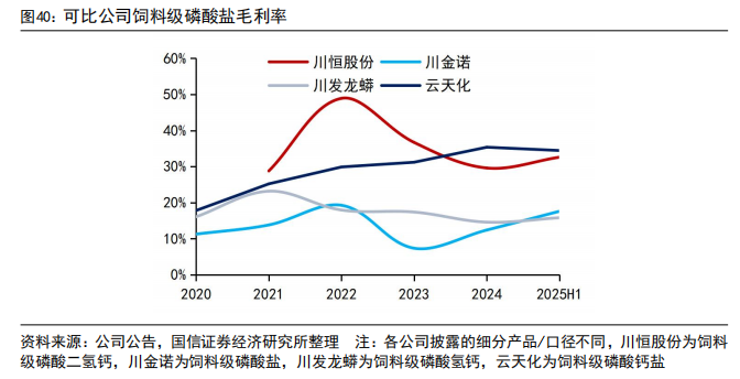 各公司饲料级磷酸盐毛利率存在明显差异,主要源于产品结构及成本控制不同。川恒股份聚焦高毛利的饲料级磷酸二氢钙(MCP),其2021年和2022年毛利率高达28.79%和48.92%,显著高于同行,主因MCP技术门槛较高、水溶性好,在幼畜及水产料中具备溢价能力;云天化披露的是“饲料级磷酸钙盐”整体口径(含DCP、MCP及其他复配产品),且依托自有磷矿实现成本优势,毛利率稳步提升至35%左右,反映其一体化与产品多元化优势。