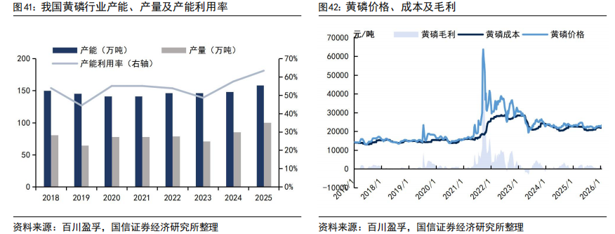 近年来,黄磷价格、毛利受政策调控、原料成本与下游需求综合影响波动。2018-2019年,“三磷”专项排查、长江经济带生态整治等环保高压政策推动云南、贵州等主产区中小产能出清,叠加下游传统需求增长乏力、磷矿石供应趋紧,行业产能利用率维持低位;2020-2021年,随着落后产能基本出清、有效供给格局趋稳,叠加下游新能源产业爆发式增长带动需求扩容,供需共振推动产能利用率阶段性抬升;2022年,云南等主产区能耗双控与限电政策导致大量产能临时停产,叠加磷矿石、电力成本暴涨压制下游采购意愿,产能利用率短暂回落;2023-2025年,经过前期产能优化后有效供给弹性下降,下游新能源需求增长与传统需求复苏共同支撑企业开工意愿,产能利用率边际回升至接近60%,但仍受制于行业产能过剩以及新增产能政策管控。