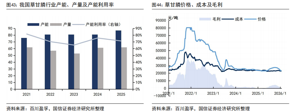 2021-2022年初,草甘膦价格受海外需求爆发、黄磷等原料成本暴涨双重驱动冲高至约8万元/吨,行业毛利同步大幅扩张;2022年下半年起,海外需求降温、库存累积,叠加黄磷成本回落,草甘膦价格快速下跌,毛利随之大幅收窄;2023年价格虽因短期供需错配出现阶段性反弹,但力度有限;2024-2025年,随着原料成本企稳、海外刚需支撑,价格震荡走稳,毛利维持在相对低位区间。