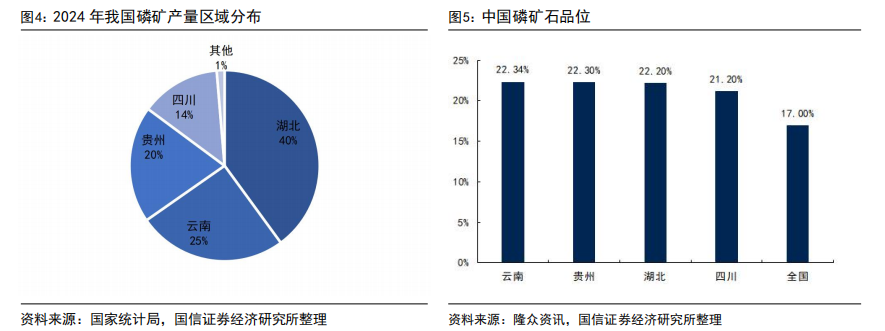 我国磷矿石资源储量供应集中在鄂滇黔川四省。中国磷矿的主产区包括:湖北省宜昌市和胡集地区;云南省滇池地区和抚仙湖地区;贵州省福泉市、开阳县、瓮安县;四川省金河-清平地区、马边县、雷波县、德阳市等。鄂滇黔川四省的磷矿储量及供给满足了全国大部分需求,形成了“南磷北运,西磷东运”磷资源供应的基本格局。湖北拥有全国最多的磷矿储量,同时是全国最大磷矿石生产省,据国家统计局数据,2024年鄂滇黔川四省磷矿石产量占全国产量的99%,湖北磷矿产量占全国产量的40%。云南、四川磷矿石多为省内自用;湖北磷矿石满足省内自用后运向安徽、江苏、河南等地;贵州也拥有较多磷矿石结余量。因此磷矿资源在地理空间上的分布具有北方少、南方多;富矿少、贫矿多的特点。
