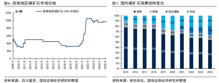 供需紧平衡格局延续,价格中枢长期高位运行。尽管磷矿石表观消费量持续增长,但国内供给端受限因素叠加,难以匹配需求扩张。一方面,富矿资源枯竭、平均品位下降、开采难度加大导致成本上升;另一方面,环保整治、安全生产监管趋严(如长江大保护、矿山安全整治)推动大量中小产能退出,有效供给收缩。虽然未来三年有部分新矿山投产,但由于项目审批周期长、建设延期普遍、跨区域运输限制以及优质矿权稀缺,新增产能释放缓慢且有限。综合来看,2026年前后国内磷矿石供需仍将维持紧平衡状态。叠加西南地区30%品位磷矿石市场价格自2021年上半年的不足400元/吨飙升至1000元/吨以上,并长期在高位震荡运行超三年,资源稀缺属性凸显,磷矿石中长期价格中枢有望维持在较高水平。