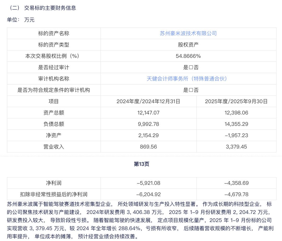 其中,现金1.32亿元为受让苏州豪米波部分股东合计持有的32.2998%股权;同时,以现金1亿元认购新增注册资本。本次增资和股权转让为一揽子交易,两项交易同步实施。