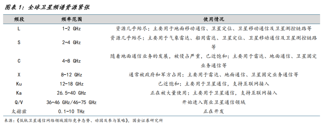 优质频率资源紧张,锁定频谱资源紧迫性增强。根据《低轨卫星通信网络领域国际竞争态势、动因及参与策略》,能够单独使用,实现全球覆盖的L、S、C频段资源几乎被占完,目前集中使用的Ku、Ka频段也是GEO宽带卫星的主要频率,同时星座之间还需要留出一定频率间隔防止相互干扰,协调难度大,锁定频谱资源的紧迫性强。