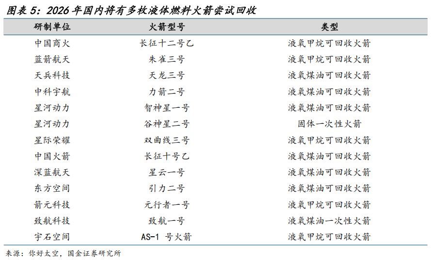 26年有望成为商业航天火箭可回收元年。商业公司和“国家队”共振,看好2026年国内进入可回收火箭元年。根据你好太空公众号统计,商业公司代表的火箭天龙三号、力箭二号等后续也将推进可回收发射项目,“国家队”长征十二号乙、长征十号乙也将在2026年尝试可回收,看好产业进入可回收火箭发射元年。
