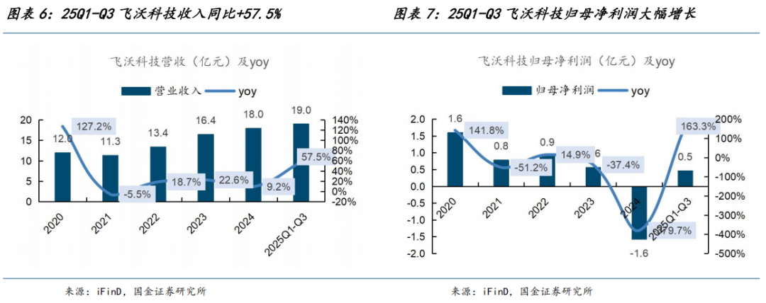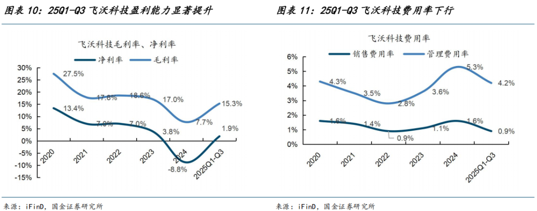 25Q1-Q3飞沃科技费用率下行,盈利能力显著提升。营收规模的增长,带来固定成本均摊降低,规模效应显现带动公司销售费用率、管理费用率下行,25Q1-Q3飞沃科技销售费用率、管理费用率为4.2%、0.9%,相对24年降低1.1pct、0.7pct。费用率下行叠加产品销售价格提升,飞沃科技25Q1-Q3净利率提升至1.9%,相对24年提升10.7pct。