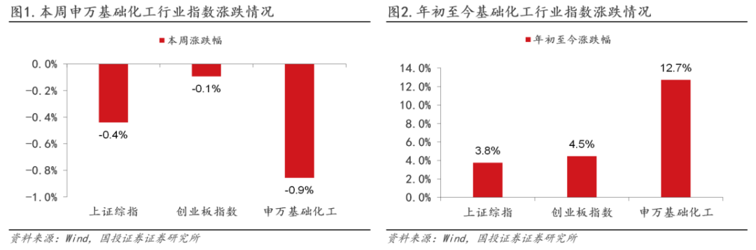 本周申万基础化工行业指数环比下降。根据Wind,本周(1/23-1/30)上证综指涨跌幅为-0.4%,创业板指数涨跌幅为-0.1%;申万基础化工行业指数涨跌幅为-0.9%,在全部31个行业板块中位列第12位,跑输上证综指0.4个百分点,跑输创业板指数0.8个百分点。年初至今,上证综指涨跌幅为 3.8%,创业板指数涨跌幅为 4.5%;申万基础化工行业指数涨跌幅为 12.7%,跑赢上证综指9个百分点,跑赢创业板指数8.3个百分点。