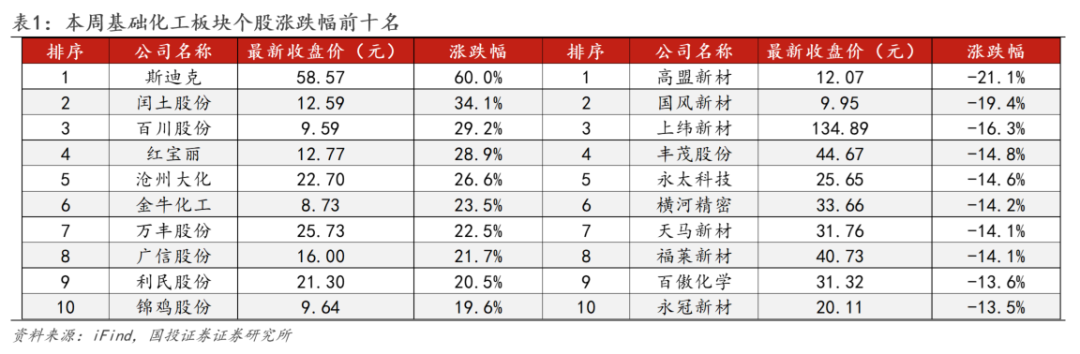 在基础化工板块424只股票中,本周163只股票上涨,260只股票下跌,1只股票持平。本周个股涨幅前十名分别为:斯迪克( 60.0%)、闰土股份( 34.1%)、百川股份( 29.2%)、红宝丽( 28.9%)、沧州大化( 26.6%)、金牛化工( 23.5%)、万丰股份( 22.5%)、广信股份( 21.7%)、利民股份( 20.5%)、锦鸡股份( 19.6%)。本周个股跌幅前十名分别为:高盟新材(-21.1%)、国风新材(-19.4%)、上纬新材(-16.3%)、丰茂股份(-14.8%)、永太科技(-14.6%)、横河精密(-14.2%)、天马新材(-14.1%)、福莱新材(-14.1%)、百傲化学(-13.6%)、永冠新材(-13.5%)。