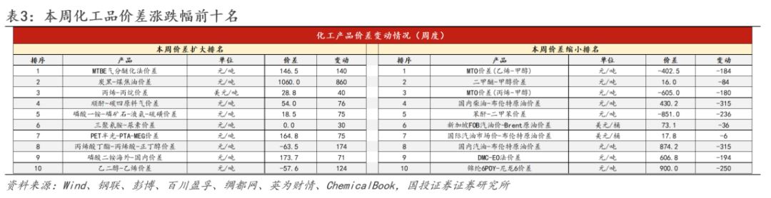 在我们监测的139种化工品中,本周有63种化工品价差上涨,13种化工品价差持平,63种化工品价差下跌。