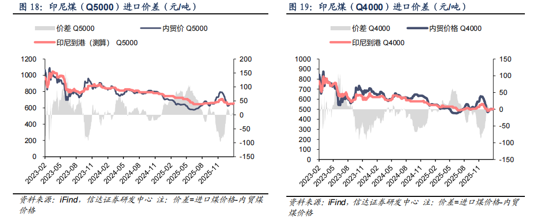 ⚫ 截至1月30日,5000大卡动力煤国内外价差7.4元/吨,周环比下跌0.4元/吨;4000大卡动力煤国内外价差2.7元/吨,周环比上涨1.4元/吨。