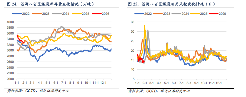 ⚫ 内陆17省:截至1月28日,内陆十七省煤炭库存较上周下降285.20万吨,周环比下降3.14%;日耗较上周下降8.30万吨/日,周环比下降1.80%;可用天数较上周下降0.20天。