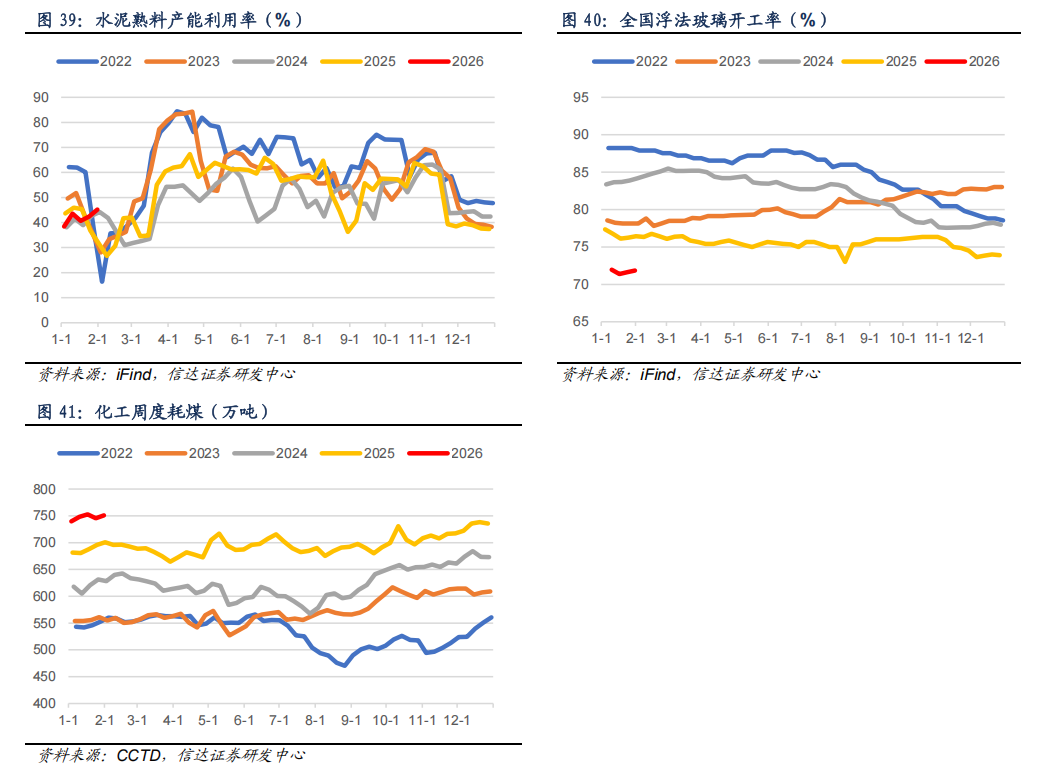 ⚫ 水泥开工率:截至1月30日,水泥熟料产能利用率为45.2%,周环比上涨2.8百分点。