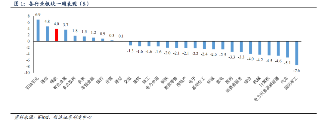 ⚫ 本周煤炭板块上涨3.98%,表现优于大盘;本周沪深300上涨0.08%到4706.34;涨跌幅前三的行业分别是石油石化(6.92%)、通信(4.77%)、煤炭(3.98%)。