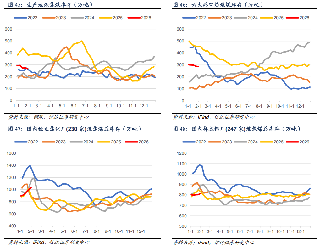 ⚫ 港口库存:截至1月30日,六大港口炼焦煤库存较上周下降3.0万吨至286.4万吨,周环比下降1.04%。