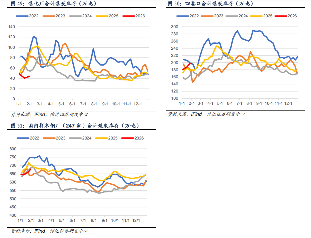⚫ 焦企库存:截至1月30日,焦化厂合计焦炭库存较上周增加1.7万吨至44.0万吨,