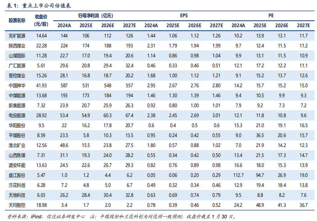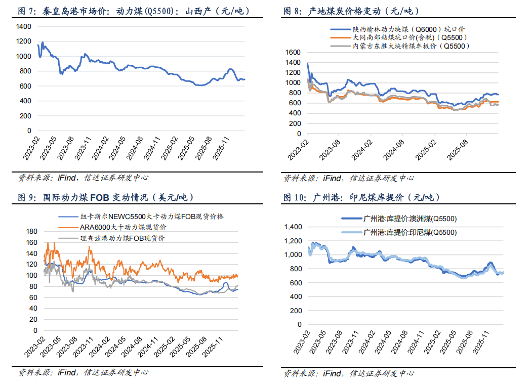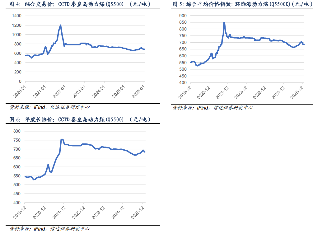 我们认为,当前正处在煤炭经济新一轮周期上行的初期,基本面、政策面共振,现阶段逢低配置煤炭板块正当时。本周基本面变化:供给方面,本周样本动力煤矿井产能利用率为88.3%(-1.3个百分点),样本炼焦煤矿井产能利用率为89.13%(-0.2个百分点)。需求方面,内陆17省日耗周环比下降8.30万吨/日(-1.8%),沿海8省日耗周环比下降7.70万吨/日(-3.3%)。非电需求方面,化工耗煤周环比上升5.29万吨/日( 0.71%);钢铁高炉开工率为79%( 0.32个百分点);水泥熟料产能利用率为45.19%( 2.77个百分点)。价格方面,本周秦港Q5500煤价收报691元/吨( 5元/吨);京唐港主焦煤价格收报1780元/吨(持平)。值得注意的是,在电厂日耗维持较好水平下,港口及电厂库存持续去化,但随着春节假期临近,工业用电逐步减弱,市场或进入趋稳运行阶段。展望后市,在国内保供产能退出政策和印尼下调煤炭产量目标影响下,煤炭供给端收缩预期强化。在库存支撑、供给收缩与需求韧性的共同作用下,全年煤炭中枢价格有望企稳回升。煤炭配置核心观点:当下,我们信达能源团队一直提出的煤炭产能短缺的底层投资逻辑未变(短期供需基本平衡,中长期仍存缺口)、煤价底部确立并中枢站上新平台的趋势未变、优质煤企高盈利&高现金流&高ROE&高分红的核心资产属性未变(ROE为10-15%,股息率>5%,新增中期分红)、以及煤炭资产相对低估且估值整体性仍有望提升的判断未变(一级矿权市场高溢价,多数公司PB约1倍),且公募基金煤炭持仓处于低配状态。基于此,煤炭板块配置策略不可忽视红利特性,又要把握顺周期弹性。即,煤炭板块向下回调有高股息边际支撑,向上弹性有后续煤价上涨预期催化,叠加伴随煤价底部确认有望带来估值重塑且具有较大提升空间,煤炭资产仍是具有性价比、高胜率和高赔率资产。我们继续坚定看多煤炭,再度提示逢低配置。总体上,能源大通胀背景下,我们认为未来3-5年煤炭供需偏紧的格局仍未改变,优质煤炭企业依然具有高壁垒、高现金、高分红、高股息的属性,叠加煤价筑底推动板块估值重塑,板块投资攻守兼备且具有高性价比,短期板块回调后已凸显出较高的投资价值,再度建议重点关注现阶段煤炭的配置机遇。