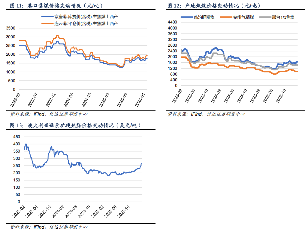 ⚫ 港口炼焦煤:截至1月30日,京唐港山西产主焦煤库提价(含税)1780元/吨,周环比持平;连云港山西产主焦煤平仓价(含税)1930元/吨,周环比持平。⚫ 产地炼焦煤:截至1月30日,临汾肥精煤车板价(含税)1650.0元/吨,周环比持平;兖州气精煤车板价980.0元/吨,周环比持平;邢台1/3焦精煤车板价1430.0元/吨,周环比持平。