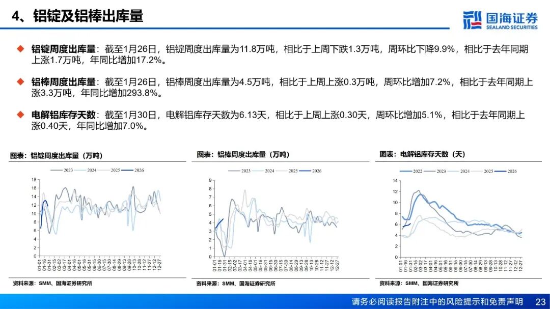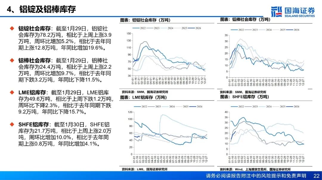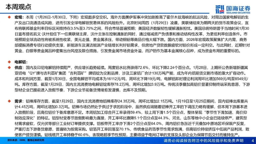 供应:国内及印尼电解铝持续爬产,供应增长趋势延续。周度铝水比例录得72.6%,环比下降2.24个百分点。1月28日,上期所公告新增新疆其亚铝电“QY”牌与吉利百矿集团“吉利百矿”牌铝锭为交割品牌,涉及三家铝厂合计130万吨产能,成为年内铝期货交割市场的重大扩容动作。成本和利润方面,截至1月30日,全国电解铝平均成本为16112元/吨,周环比下降19元/吨,电解铝即时理论利润周环比增加569元/吨至8549元/吨。库存方面,截至1月29日,国内主流消费地电解铝锭库存78.2万吨,周环比增加3.9万吨。传统淡季叠加高铝价显著抑制终端采购意愿,下游型材企业已提前进入放假节奏,下游企业节前备货情绪愈发谨慎,出库不及预期。