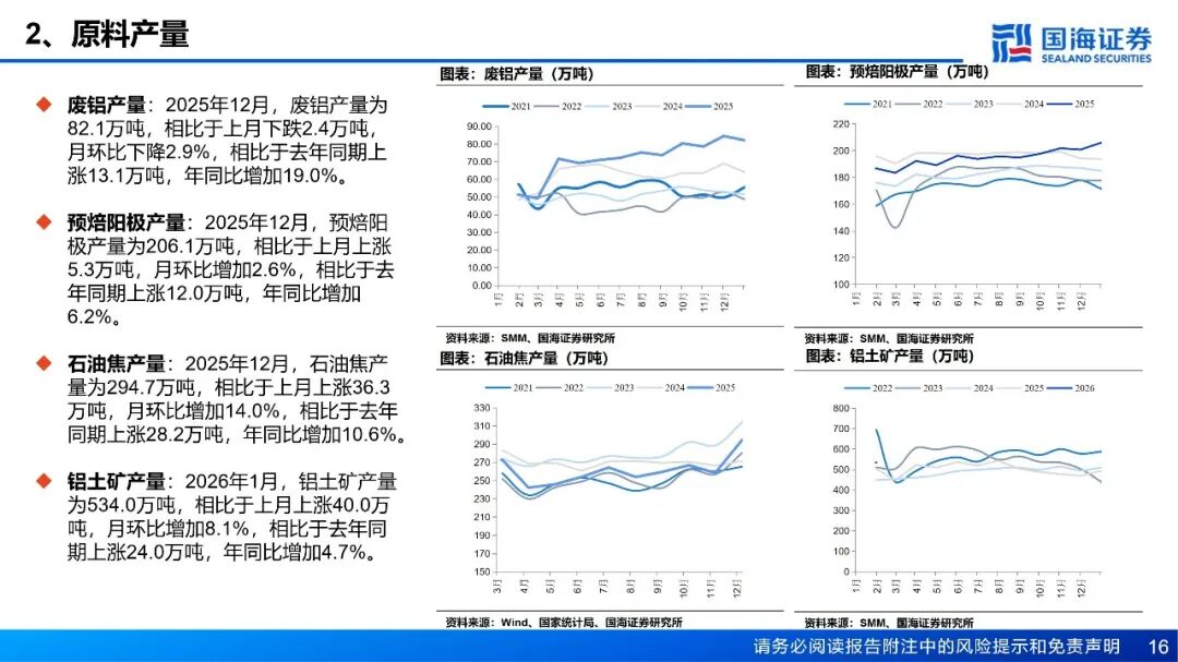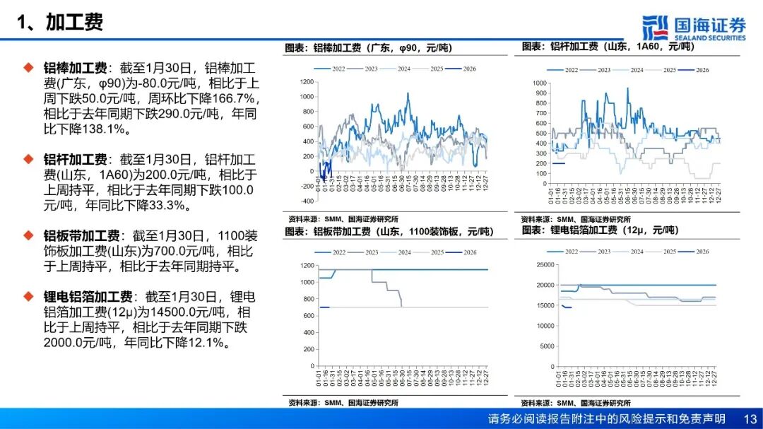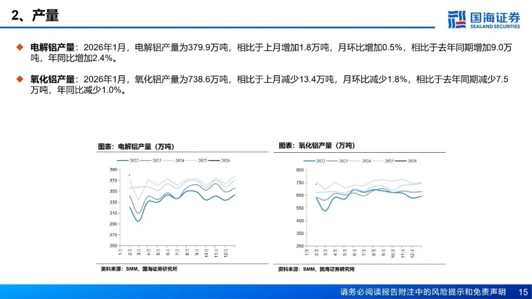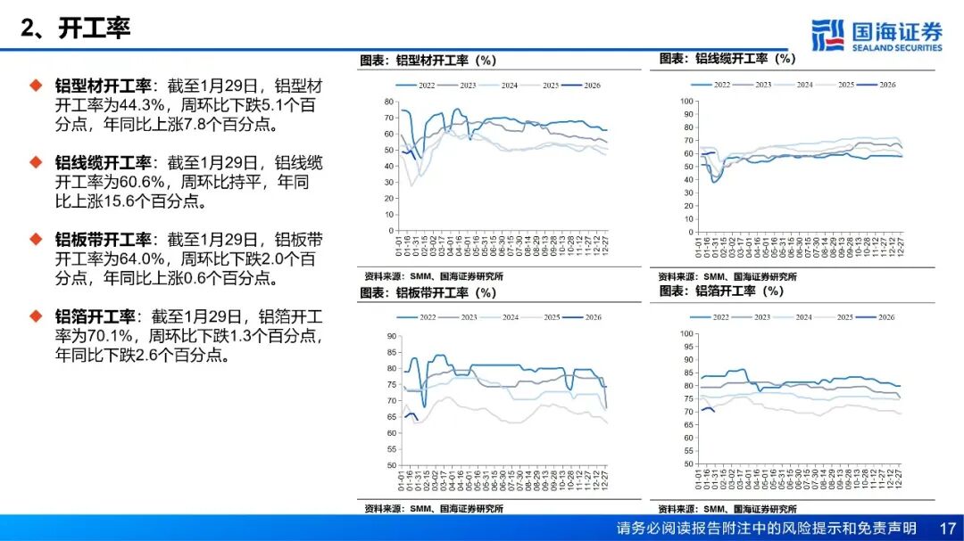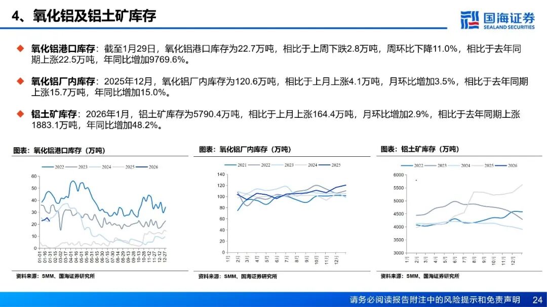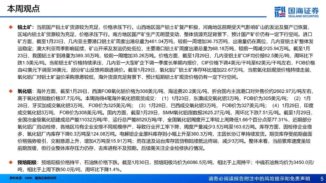 需求:铝棒库存方面,截至1月29日,国内主流消费地铝棒库存24.35万吨,周环比增加2.15万吨。1月19日至1月25日期间,国内铝棒出库量共计4.45万吨,周环比增加0.3万吨。铝棒市场仍然处于供过于求的阶段中,虽然供应端随着铝棒开工率的下调压力略有缓解,但本周下游基本进入放假阶段,且高位铝价下备库意愿不足。本周铝加工综合开工率录得59.4%,较上周下滑1.5个百分点,整体呈现“季节性下滑加速、高价抑制效应深化”的特征。铝型材受春节放假影响最为直接,开工率环比骤降5.1个百分点至44.3%,河北、山东等地中小企业已陆续停产,建筑型材需求疲软,仅光伏等部分工业材订单提供支撑。铝板带开工率亦下滑2个百分点至64.0%,周内铝价急涨近千元叠加中原地区环保限产反复,严重打击下游备货意愿,普遍转为按需采购。铝箔开工率回落至70.1%,传统食品药箔季节性需求饱满,但高铝价持续挤压中低端产品利润,致使客户提货谨慎。铝线缆开工率持稳于60.6%,表现略超季节性预期,主要得益于电网订单的支撑及头部企业为保障节后交付而维持生产。铝土矿:当前国产铝土矿货源较为充足,价格承压下行。山西地区国产铝土矿复产积极,河南地区前期受天气影响矿山的发运及复产已恢复,区域内铝土矿货源较为充足,价格承压下行。南方地区国产矿生产无明显变动,整体货源充足背景下,预计国产矿价仍有一定下行空间。进口矿方面,截至1月23日,几内亚主要港口铝土矿周度出港总量为461.04万吨,较前一周增加36.75万吨,出港量仍在高位,几内亚铝土矿整体发运稳定;澳大利亚雨季影响延续,矿山开采及发运仍处低位,主要港口铝土矿周度出港总量为68.18万吨,较前一周减少25.94万吨。截至1月23日,我国铝土矿到港量为389.35万吨,较前一周增加35.26万吨。价格方面,截至1月29日,几内亚铝土矿CIF均价报62.5美元/吨,周环比下跌1.5美元/吨。当前铝土矿价格持续承压,几内亚一大型矿企下调一季度长单期内报价,CIF价格下调4美元/干吨至62美元/干吨左右,FOB价格由42美元下调至38美元,部分矿山反馈将跟进调价。截至1月29日,氧化铝厂铝土矿库存环比增加22.67万吨,当前氧化铝现货价格持续走弱,氧化铝厂对铝土矿溢价采购意愿较低,海外货源充足背景下,预计短期铝土矿现货价格仍有一定下行空间。