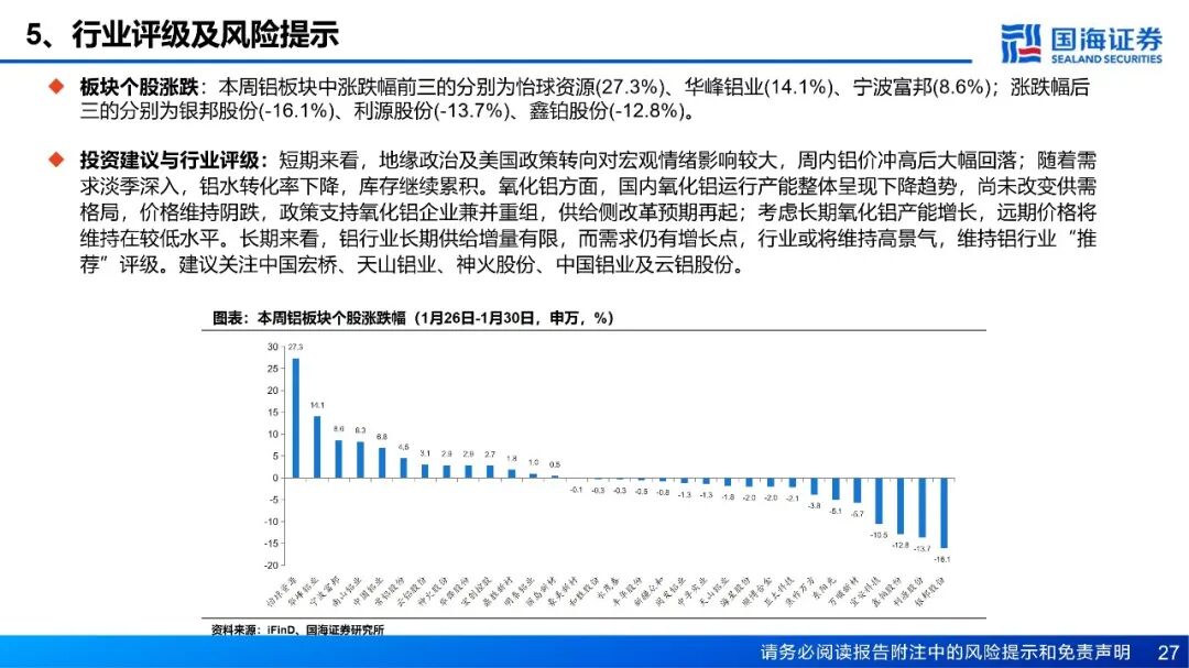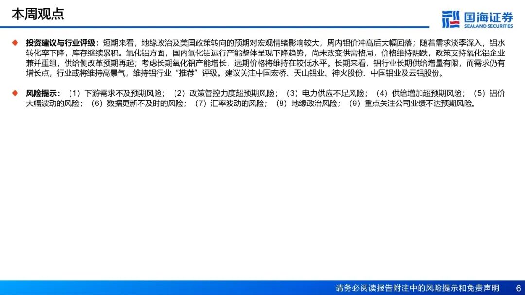 投资建议与行业评级:短期来看,地缘政治及美国政策转向的预期对宏观情绪影响较大,周内铝价冲高后大幅回落;随着需求淡季深入,铝水转化率下降,库存继续累积。氧化铝方面,国内氧化铝运行产能整体呈现下降趋势,尚未改变供需格局,价格维持阴跌,政策支持氧化铝企业兼并重组,供给侧改革预期再起;考虑长期氧化铝产能增长,远期价格将维持在较低水平。长期来看,铝行业长期供给增量有限,而需求仍有增长点,行业或将维持高景气,维持铝行业“推荐”评级。建议关注中国宏桥、天山铝业、神火股份、中国铝业及云铝股份。