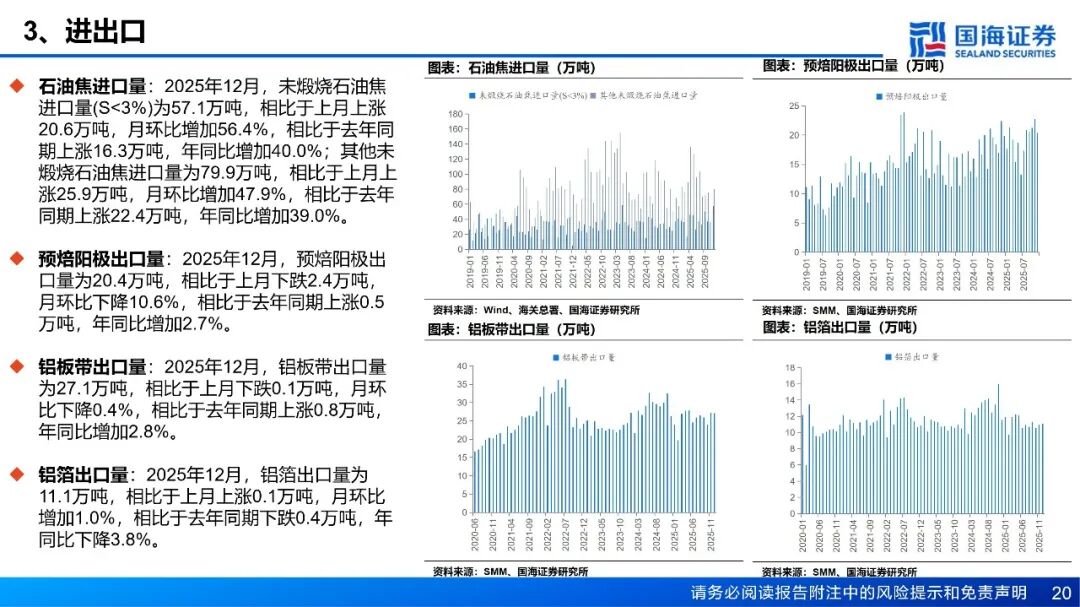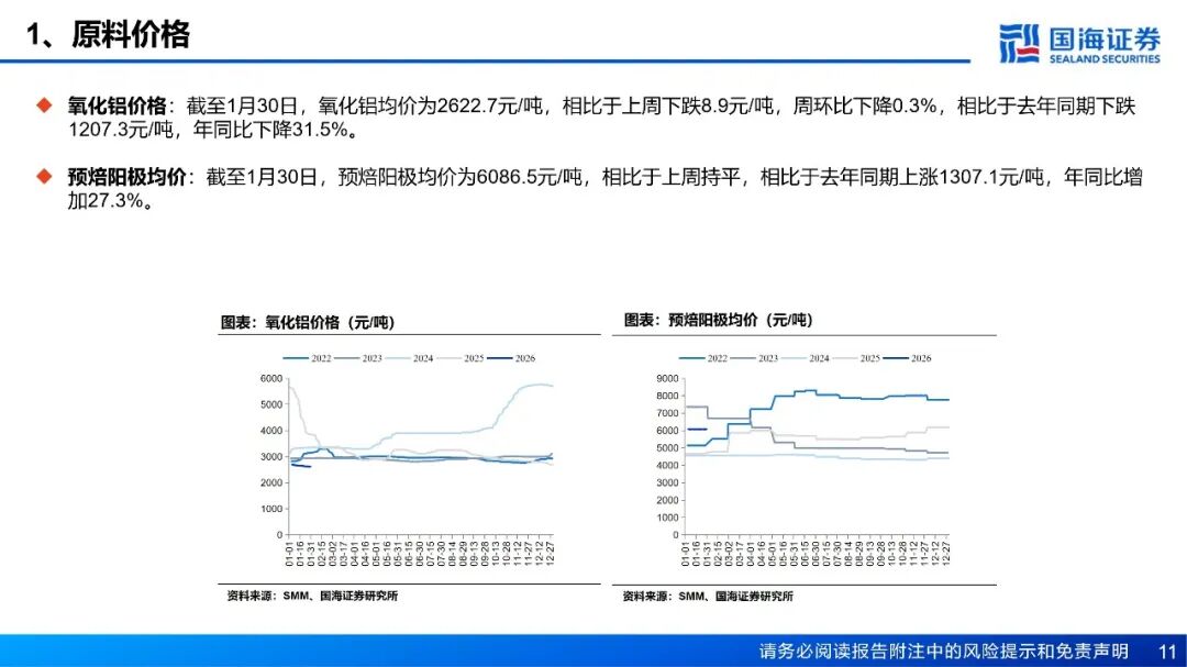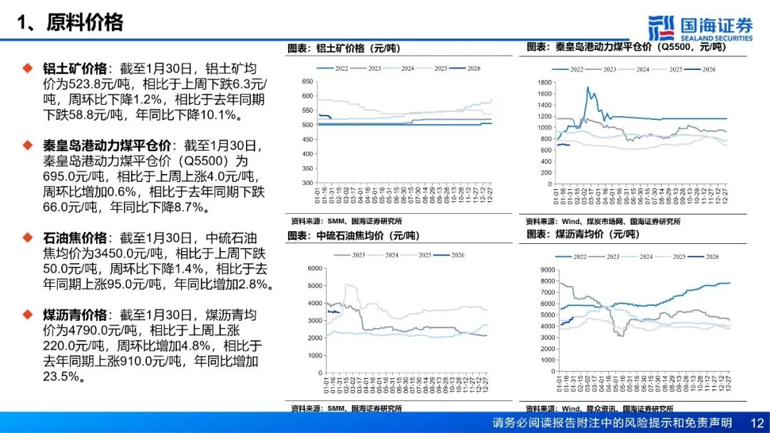 预焙阳极:预焙阳极价格持平,石油焦价格下跌。截至1月30日,预焙阳极均价为6086.5元/吨,相比于上周持平;中硫石油焦均价为3450.0元/吨,相比于上周下跌50.0元/吨,周环比下降1.4%。