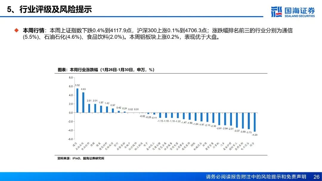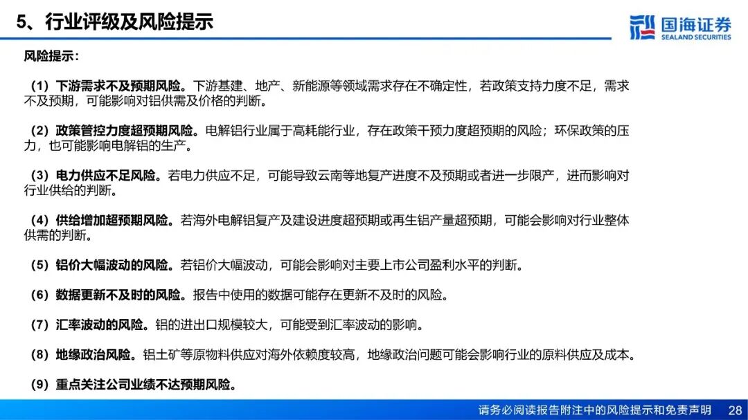 风险提示:(1)下游需求不及预期风险;(2)政策管控力度超预期风险;(3)电力供应不足风险;(4)供给增加超预期风险;(5)铝价大幅波动的风险;(6)数据更新不及时的风险;(7)汇率波动的风险;(8)地缘政治风险;(9)重点关注公司业绩不达预期风险。