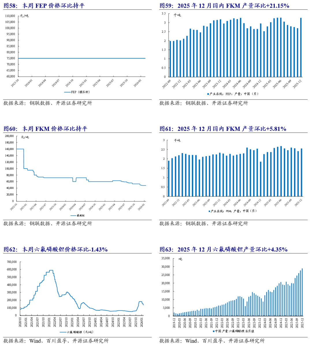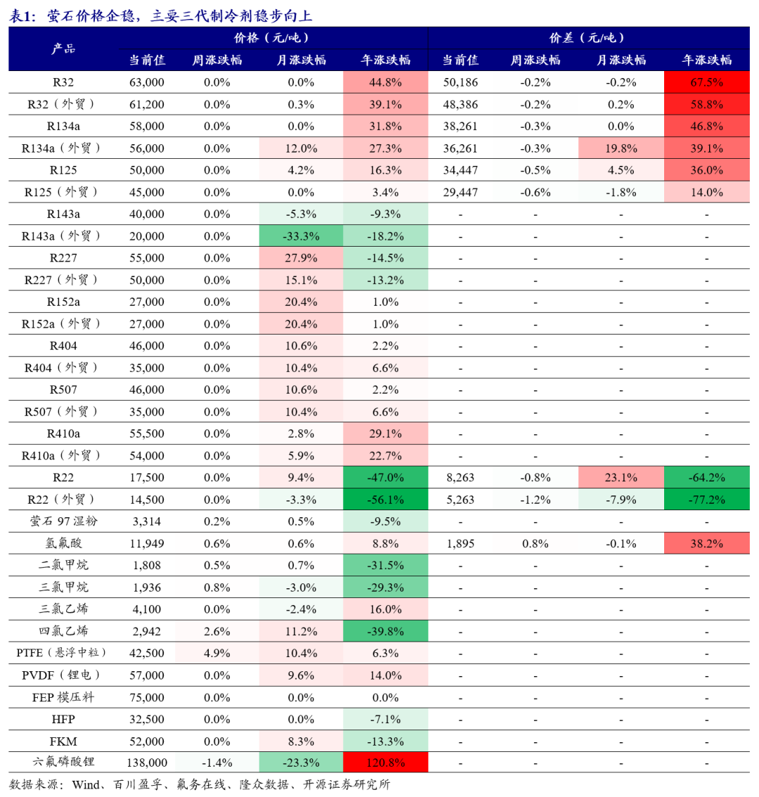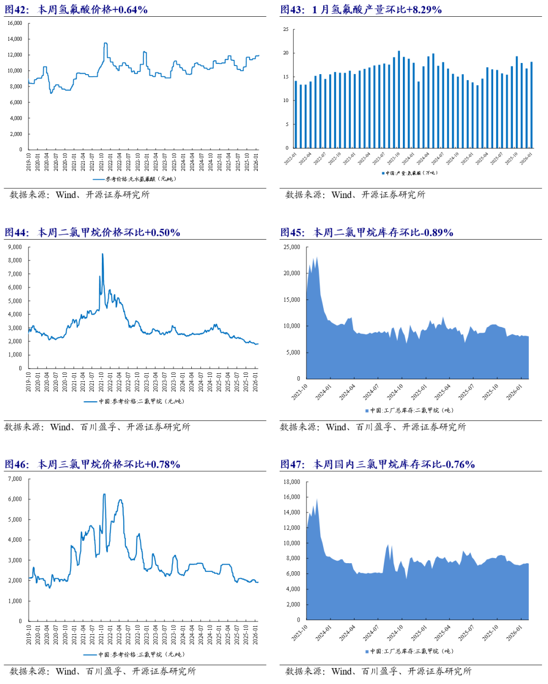 本周(1月26日-1月30日)三代制冷剂企稳运行,或酝酿新一轮涨势。截至01月30日,(1)R32价格、价差分别为63,000、50,186元/吨,较上周分别持平、-0.15%;较12月分别持平、-0.16%;较2025年分别 44.83%、 67.48%。(2)R125价格、价差分别为50,000、34,447元/吨,较上周分别持平、-0.54%;较12月分别 4.17%、 4.46%;较2025年分别 16.28%、 36.04%。(3)R134a价格、价差分别为58,000、38,261元/吨,较上周分别持平、-0.27%;较12月分别持平、-0.04%;较2025年分别 31.82%、 46.78%。(4)R143a价格为40,000元/吨,较上周持平;较12月-5.30%;较2025年-9.30%。(5)R227价格为55,000元/吨,较上周持平;较12月 27.91%;较2025年-14.47%。(6)R152a价格为27,000元/吨,较上周持平;较12月 20.36%;较2025年 1.00%。(7)R410a价格为55,500元/吨,较上周持平;较12月 2.78%;较2025年 29.07%。(8)R404价格为46,000元/吨,较上周持平;较12月 10.58%;较2025年 2.24%。(9)R507价格为46,000元/吨,较上周持平;较12月 10.58%;较2025年 2.24%。(10)R22价格、价差分别为17,500、8,263元/吨,较上周分别持平、-0.75%;较12月分别 9.38%、 23.08%;较2025年分别-46.97%、-64.18%。