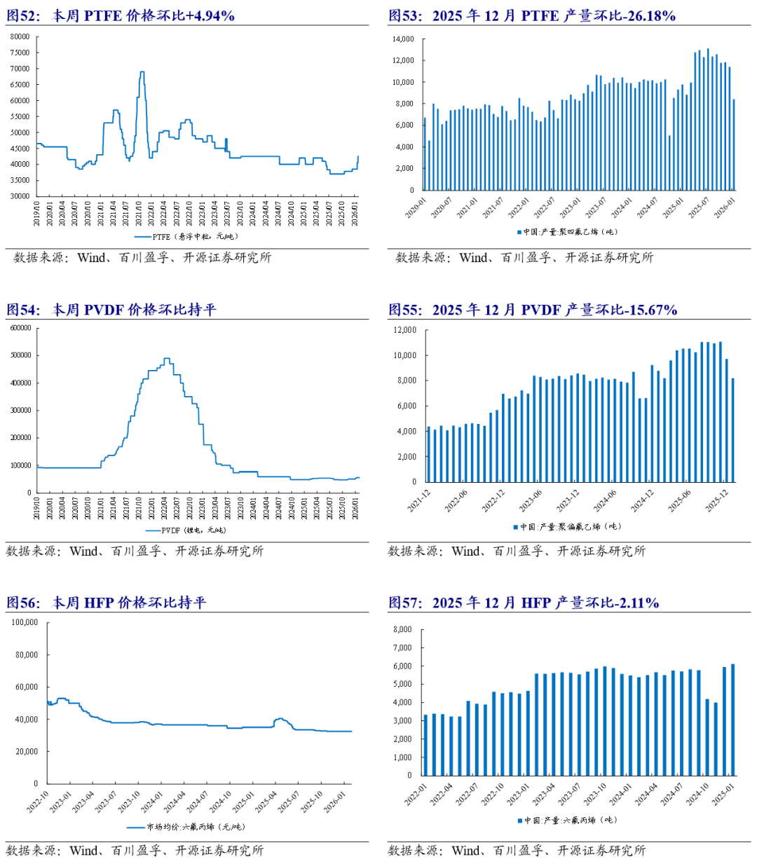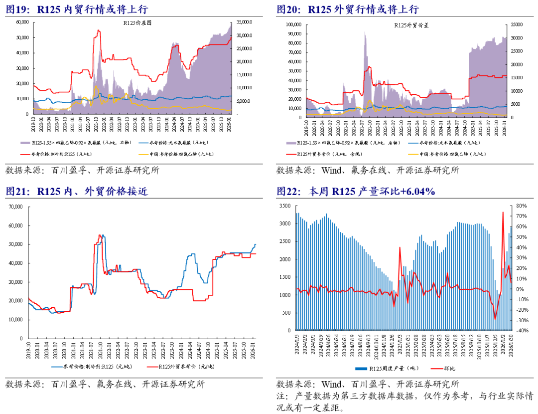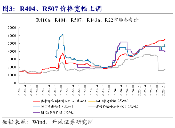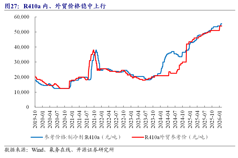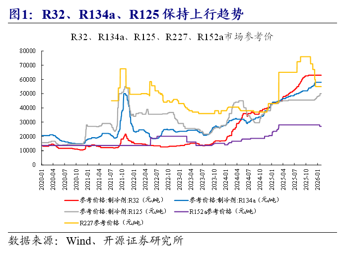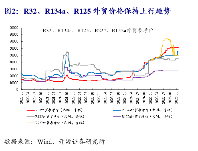 又据氟务在线跟踪,制冷剂市场进入需求淡季,年后出口逐步重启,但受出口许可证办理时间较长影响,尚未完全恢复,随着A5国家进入配额基线年尾声,其对高GWP制冷剂的进口需求有望集中释放,有望带动相关产品出口增长,并进一步拉动内贸市场,市场价格调整有待国内需求增量时机。此前市场预期偏保守的高GWP品种R125也在年尾逐步上调,或将影响年内“高GWP转低GWP”的比例安排,低位品种均价有望抬升。此外,行业整体库存已处于近两年低位,叠加生产端受配额限制及行业集中度较高等因素影响,企业惜售情绪普遍存在,进一步支撑价格走强,春节前企业开工保持低位。受R125价格上涨传导,R410a一季度长协价已上调至55100元/吨附近;R404、R507市场价格上涨至49000元/吨;R134a散单成交约56000元/吨,部分车企长协价突破62000元/吨,高位价格一定程度锁定了市场对未来走势的预期;R32近期散水报价在61200-62000元/吨区间,涨势虽有所放缓,但后续季节性采购仍可能推动行情再次上行;二代制冷剂R22企业报价维持在17000元/吨左右,其中小包装成交相对活跃,散水供应仍偏紧,出口价格则略有松动。整体来看,在低库存、供给受限的背景下,随着后续需求逐步回暖,尤其是旺季来临,制冷剂价格上涨动能充足。