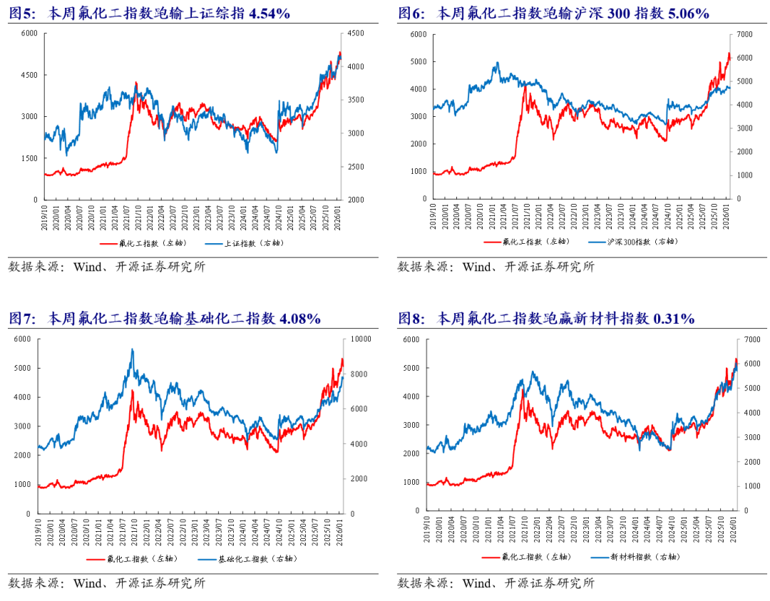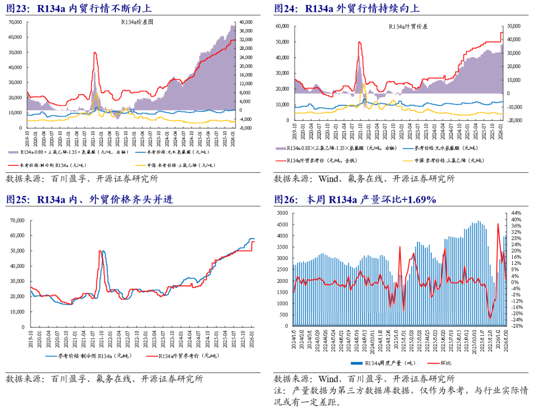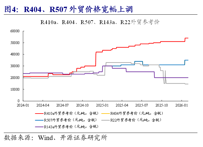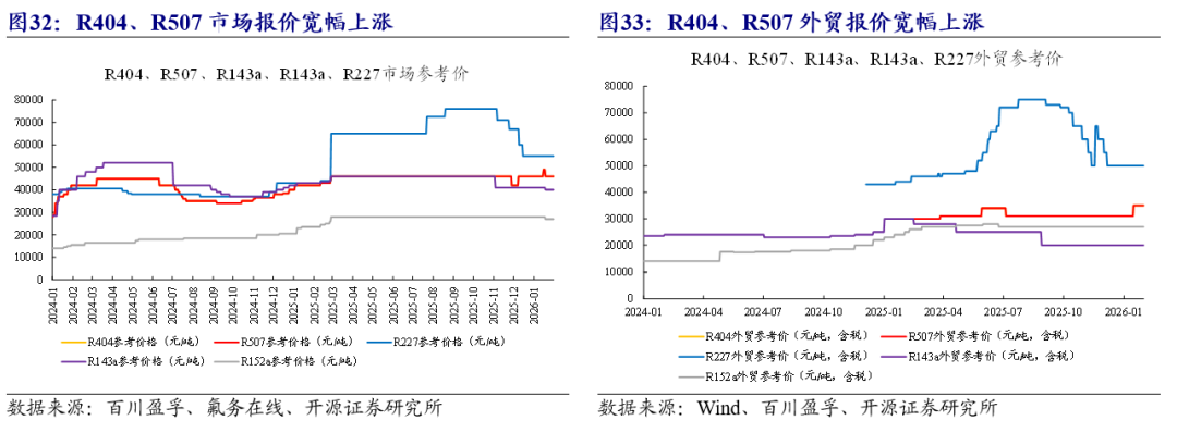其中外贸市场,截至1月30日,【R143a】外贸参考价20,000元/吨,较上周持平;1月均价(截至1月30日)为20,000元/吨,同比-33.33%,环比持平;2026年(截至1月30日)均价为20,000元/吨,较2025年均价-18.16%。【R404】外贸参考价35,000元/吨,较上周持平;1月均价(截至1月30日)为33,133元/吨,同比 10.44%,环比 6.88%;2026年(截至1月30日)均价为33,133元/吨,较2025年均价 6.64%。【R507】外贸参考价35,000元/吨,较上周持平;1月均价(截至1月30日)为33,133元/吨,同比 10.44%,环比 6.88%;2026年(截至1月30日)均价为33,133元/吨,较2025年均价 6.64%。【R227】外贸参考价50,000元/吨,较上周持平;1月均价(截至1月30日)为50,000元/吨,同比 15.07%,环比-1.64%;2026年(截至1月30日)均价为50,000元/吨,较2025年均价-13.16%。【R152a】外贸参考价27,000元/吨,较上周持平;1月均价(截至1月30日)为27,567元/吨,同比 20.36%,环比-1.55%;2026年(截至1月30日)均价为27,567元/吨,较2025年均价 1.00%。