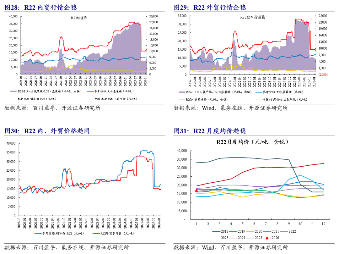 其中R22外贸市场,截至1月30日,R22外贸参考价格14,500元/吨,较上周同期持平;价差为5,263元/吨,较上周同期-1.18%;1月外贸参考均价(截至1月30日)为14,500元/吨,环比-3.33%;2026年(截至1月30日)外贸参考价格为14,500元/吨,较2025年-46.73%。