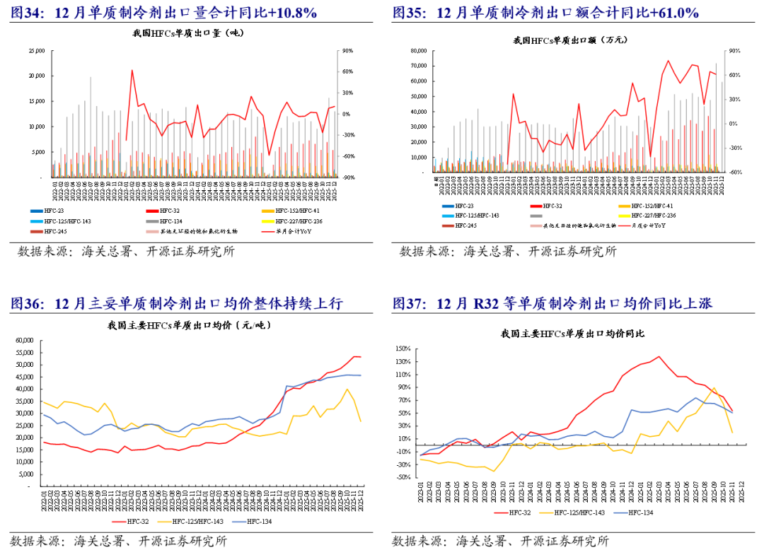 据海关总署数据,2025年我国HFCs单质制冷剂总出口量约为24.2万吨,同比-3.0%;出口总额约为104.9亿元,同比 54.2%。其中R32、R125/R143、R134出口量分别为63,806、13,198、121,133吨,分别同比 22.2%、-14.6%、 5.7%;出口均价分别为46,749、30,302、44,334元/吨,分别同比 94%、 34%、 59%。