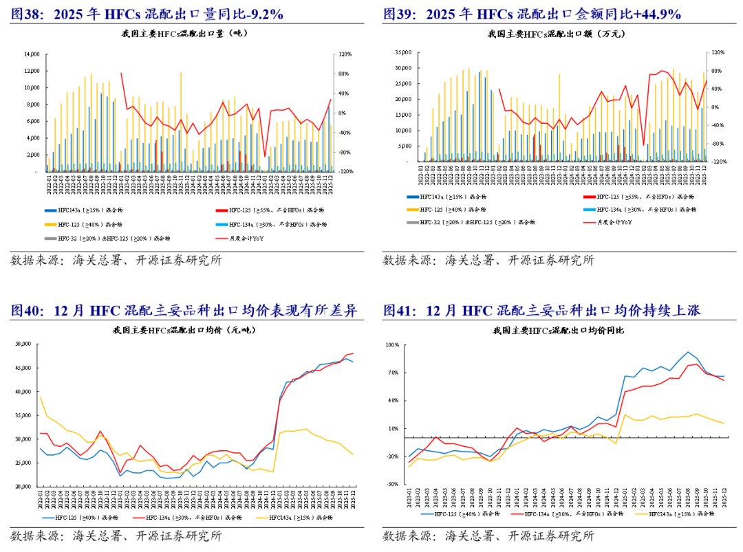 据海关总署数据,2025年我国HFCs混配制冷剂总出口量约为13.4万吨,同比-9.2%;出口总额约为58.5亿元,同比 44.9%。其中HFC143a(≥15%)混合物、HFC-125(≥40%)混合物、HFC-134a(≥30%,不含HFOs)混合物、其他混合物出口量分别为44,567、62,332、7,825、17,109吨,分别同比 8.7%、-22.7%、-17.6%、 121.4%;出口均价分别为29,682、44,840、44,870、71,878元/吨,分别同比 20%、 76%、 65%、 23%。