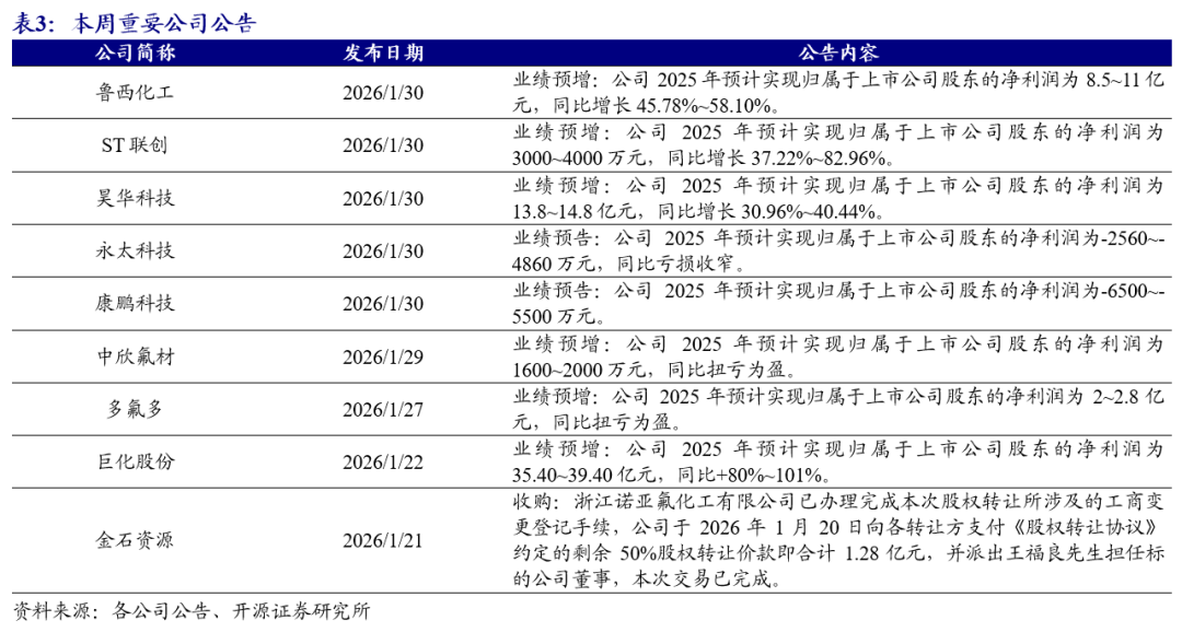 【巨化股份】2025年预计实现归属于上市公司股东的净利润为35.40~39.40亿元,同比 80%~101%。【昊华科技】2025年预计实现归属于上市公司股东的净利润为13.8~14.8亿元,同比增长30.96%~40.44%。【鲁西化工】2025年预计实现归属于上市公司股东的净利润为8.5~11亿元,同比增长45.78%~58.10%。【ST联创】2025年预计实现归属于上市公司股东的净利润为3000~4000万元,同比增长37.22%~82.96%。【中欣氟材】2025年预计实现归属于上市公司股东的净利润为1600~2000万元,同比扭亏为盈。