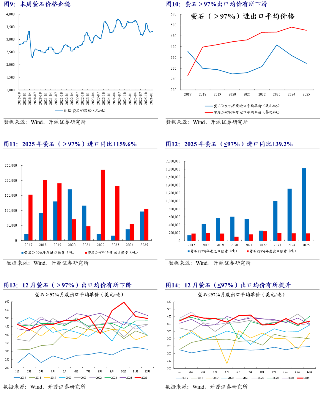 萤石:据百川盈孚数据,截至1月30日,萤石97湿粉市场均价3,314元/吨,较上周同期上涨0.15%;1月均价(截至1月30日)3,310元/吨,同比下跌9.61%;2026年(截至1月30日)均价3,310元/吨,较2025年均价下跌4.92%。