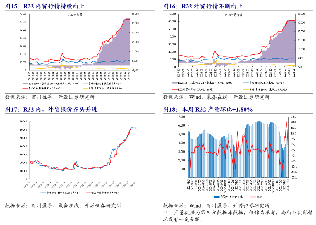 本周(1月26日-1月30日)R32上行趋势不变。据百川盈孚数据,截至1月30日,R32市场均价63,000元/吨,较上周同期持平;价差为50,186元/吨,较上周同期-0.15%;1月均价(截至1月30日)为63,000元/吨,环比持平;2026年(截至1月30日)均价为63,000元/吨,较2025年均价 17.41%。本周R32产量为5,439吨,环比 1.80%。