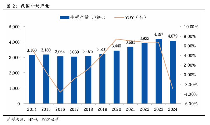 2024年,我国牛奶产量为4079万吨,同比下滑2.80%。2014-2024年我国牛奶产量的年复合增速约为2.59%。其中,2014-2018年,我国牛奶产量相对稳定;而2019年以来,我国牛奶产量增长明显加快,直至2024年因为需求疲软出现小幅下滑。