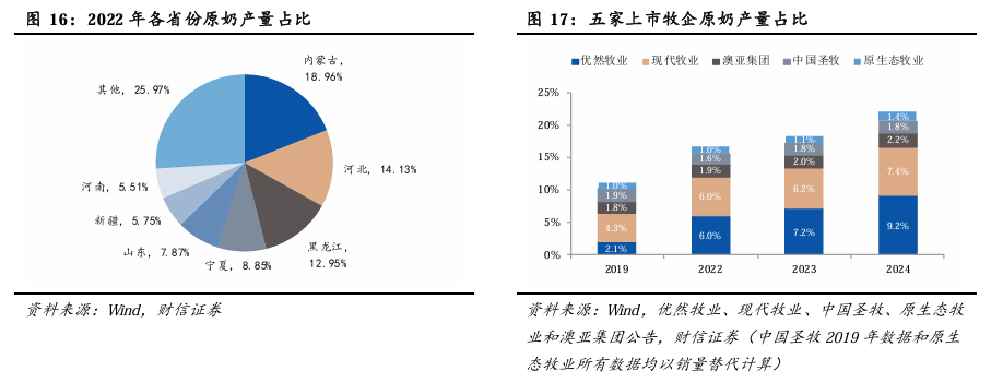 原奶供应市场分散,但集中度在持续提升。受奶牛饲养习性、气候条件以及植被分布等多重因素的综合影响,我国牛奶生产区域主要集中在北方区域。2022年,国内主要原奶产区分别为内蒙古、河北、黑龙江、宁夏、山东、新疆和河南,CR7达74%。因行业特性,奶牛养殖较为分散,尚未孕育出占据市场主导地位的大型企业。2024年,优然牧业、现代牧业、澳亚集团、中国圣牧和原生态牧业的原奶产量分别为375/301/92/74/57万吨,占比分别为9.19%/7.37%/2.25%/1.80%/1.39%,CR5从2019年的11.20%提升至2022年的16.68%,再次提升至2024年的21.99%。