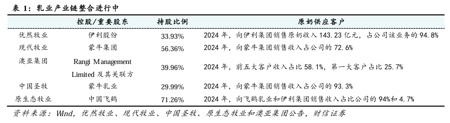 1) 乳业产业链整合进行中。国内中游乳制品制造环节的集中度高,为确保原奶供应稳定,控制产品安全和质量,大型乳制品企业向产业链上游发展,与上游产业链的行业参与者进行整合。