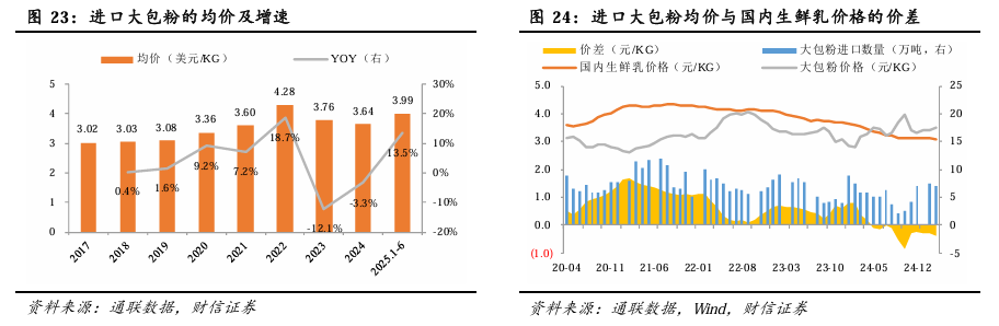 3) 国外大包粉价格已经倒挂。2024Q2开始,国外大包粉进口价格已经明显高于国内原奶均价,不具备性价比,可支撑国内原奶价格景气修复。