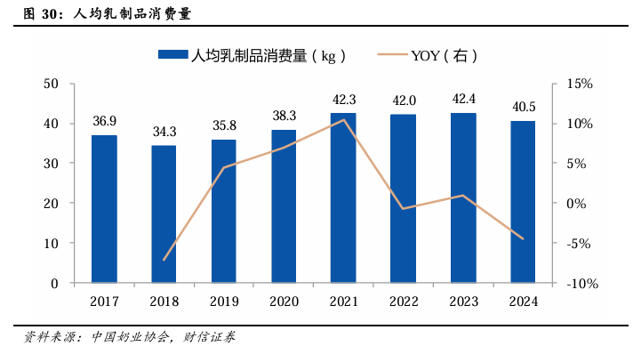 近年来,我国人均乳制品消费相对稳定,基本维持在40-42 Kg/年的水平。2024年,我国人均乳制品消费量为40.5Kg,略有下滑。