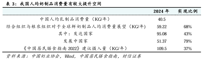 我国人均奶制品消费量有较大提升空间。根据经合组织与粮农组织对于鲜奶制品人均消费量的展望,2024年全球人均消费量为59.22 kg/年,其中,发达国家和发展中国家分别为95.08和51.37 kg/年。此外,根据《中国居民膳食指南2022》对于摄入量的建议为300 g/日,对应109.5 kg/年。