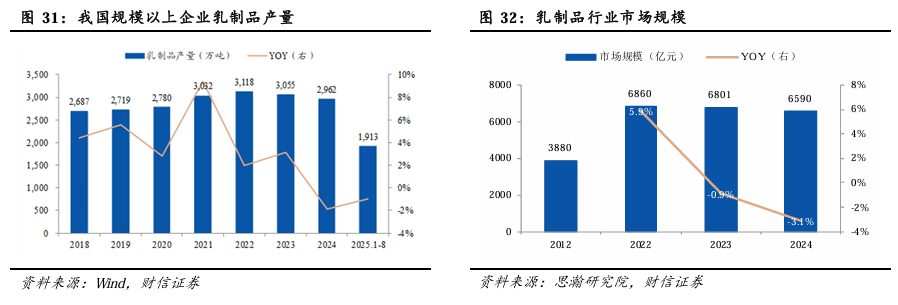 我国乳制品产量一直维持相对稳健的增速。2024-2025年,因下游需求疲软,乳制品产量出现连续下滑。2024年,我国规模以上企业乳制品产量为2962万吨,同比下滑1.90%,终结了此前多年的稳步增长态势;2025年前8个月,乳制品产量为1913万吨,同比下滑1.00%。据思瀚研究院数据显示,2012-2022年,随着居民生活水平的提高,乳制品行业市场规模从3880亿元增加至6860亿元,CAGR为5.9%。当前,受消费弱复苏等因素影响,乳制品行业市场规模面临阶段性调整,2024年,乳制品行业市场规模为6590亿元,同比下降3.1%。