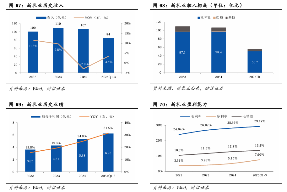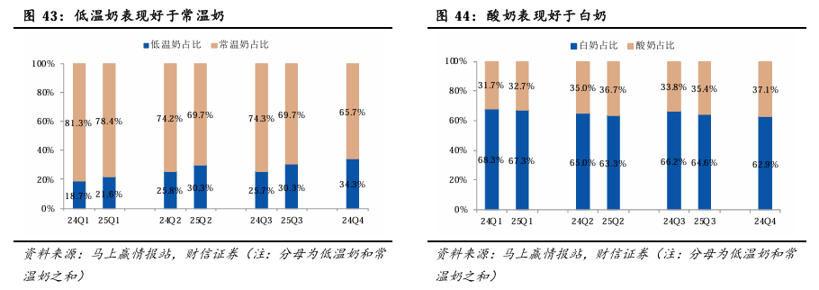 从常温奶和低温奶内部占比来看,低温奶占比提升趋势明显。2025Q1-3,低温奶在液体奶中占比分别提升2.92/4.51/4.68pp。从白奶和酸奶内部占比来看,酸奶占比持续提升。2025Q1-3,酸奶在液体奶中占比分别提升1.02/1.70/1.64pp。