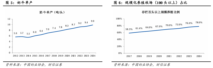 通过品种改良、精细喂养、精益化管理等措施,我国奶牛行业实现了单产跨越。我国奶牛单产从2014年的5.5吨提升至2024年的9.9吨,年复合增速达到6.13%。规模化牧场的占比也在逐年提升,存栏百头以上规模养殖比例从2017年的58.3%提升至78.0%。根据中国畜牧兽医年鉴,年存栏1000头以上的户数从2017年的1356户增加至2023年的1696户,其占比从7.56%提升至12.21%。奶牛单产持续提升的主要原因:1)青贮质量提升,实现精细喂养;2)牧场牛群结构调整,只饲养高产核心牛群,实现品种改良;3)管理水平提升,实现精益化管理。