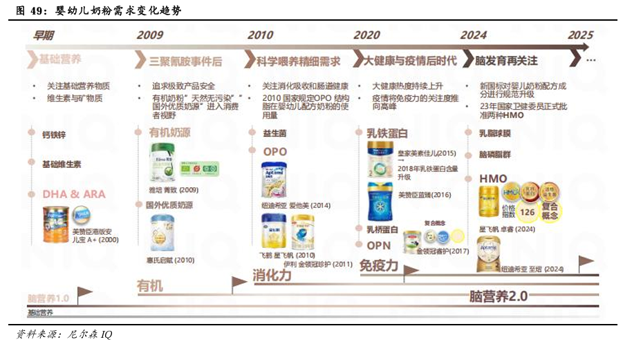 消费者对于婴幼儿产品的偏好受明显的时代驱动,从早期注重基础营养,到讲究科学喂养下的精细需求,再到当前关注脑发育变化。消费者需求提升驱动产品持续创新升级,也推动行业往高端化发展。