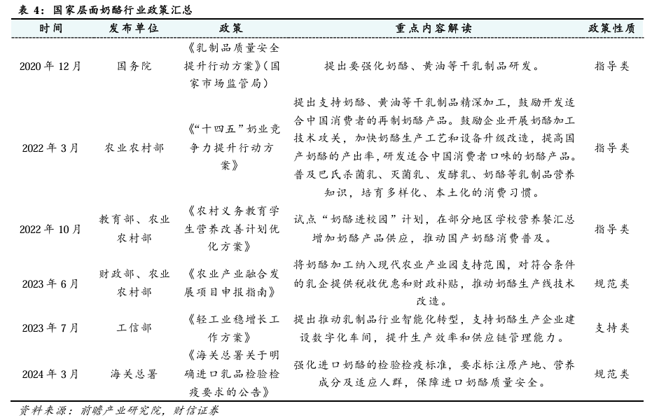 我国围绕支持牧场改造和乳企技术升级,推动奶酪等干乳制品精深加工,提升国产乳制品竞争力等方面密集出台了多项国家政策。