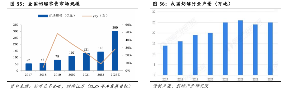 奶酪在中西餐、茶咖和烘焙行业的渗透率正在持续提升。中西餐市场中,乳制品已成为品类创新核心载体,在上下游协同创新趋势下,奶酪企业能通过创新产品与全链路协同模式深化场景渗透。根据红餐产业研究院与蒙牛专业乳品(内蒙蒙牛面向餐饮客户开辟的专业餐饮品牌)联合发布的《烘焙品类发展报告2025》,烘焙市场规模扩张且健康化、本土化趋势显著,马斯卡彭等高端奶酪需求攀升,国产原料接受度提升,国内奶酪企业可依托本土供应链提供高品质、清洁标签的原料及解决方案。新茶饮行业头部品牌对产品品质、生产规范及供应链定制创新的高要求,为国内奶酪企业凭高品质、标准化及定制能力切入茶饮赛道创造契机。同时,B端市场对奶酪的需求也为乳制品深加工各环节副产品拓展了更适配的应用场景。