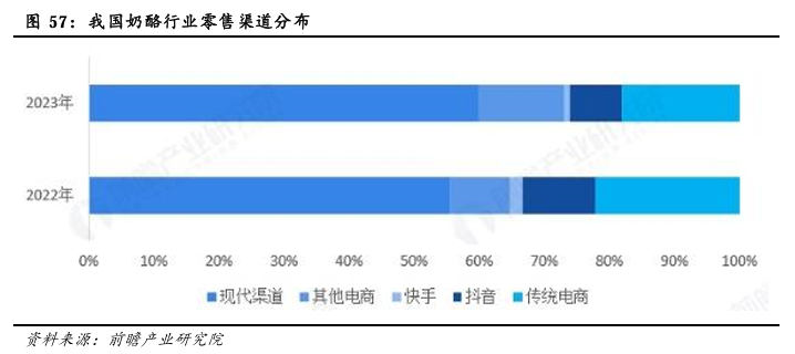 从渠道结构来看,零售渠道仍以线下为主。奶酪品类整体消费仍以线下渠道销售为主,2023年市场销售现代渠道占比高达60%,相比2022年提升5%,现代渠道,即大型商超、大型连锁商超的销售通路。传统电商、内容电商等线上渠道均在奶酪销售上逐年递减。